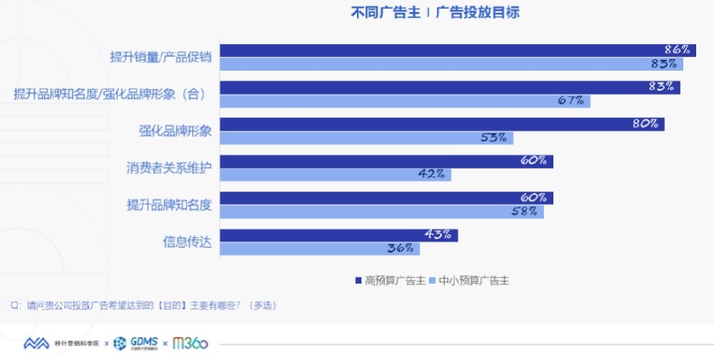 如何打赢营销效率之战,是品牌在新周期下的发力重点。根据秒针营销科学院、GDMS与M360发布的《2023中国数字营销趋势报告》,市场压力之下,不同预算体量的广告主,均把“提升销量/产品促销”设置为广告投放的首位目标。
