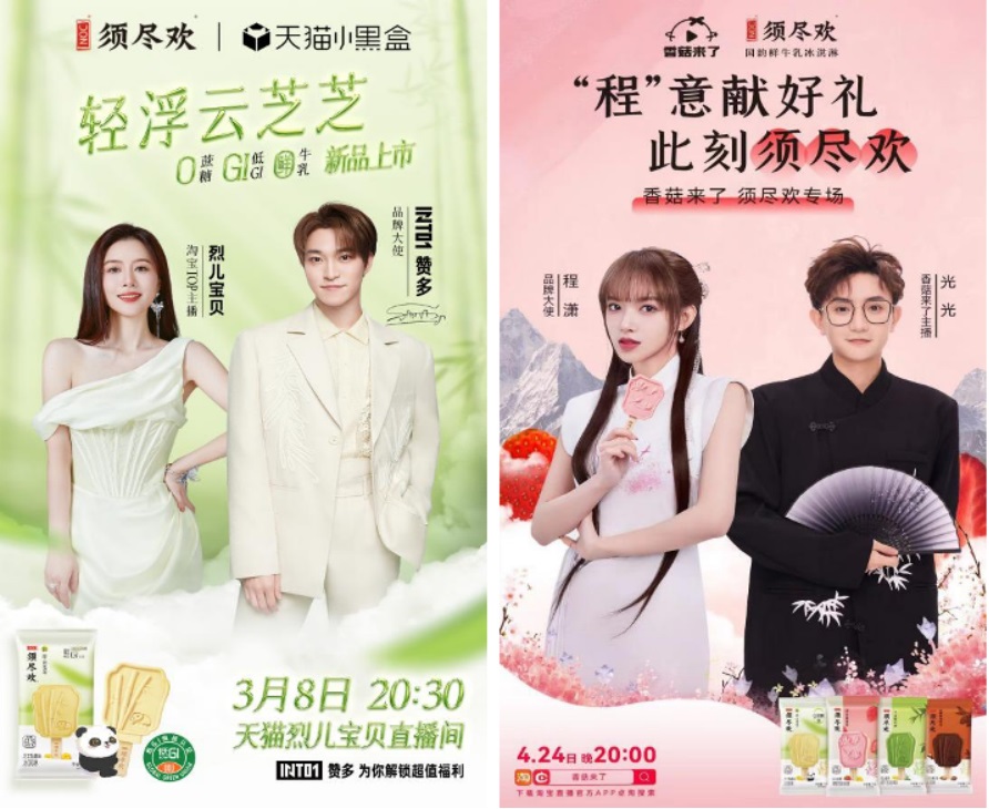 高端冰淇淋品牌须尽欢,独家冠名优酷女子齐舞舞社竞技真人秀《了不起!舞社2》,将品牌主张与综艺场景深度结合,给观众留下“国韵高品质鲜牛乳冰淇淋”的深刻印象。结合品牌新品上市节点,须尽欢品牌大使、节目主理人程潇亮相香菇来了淘宝直播间,赞多空降烈儿宝贝直播间,给粉丝惊喜福利,以“IP+明星+淘宝TOP级主播”组合拳,极致放大IP种草转化效果,直接带动营销增量,燃爆夏季品效营销。
