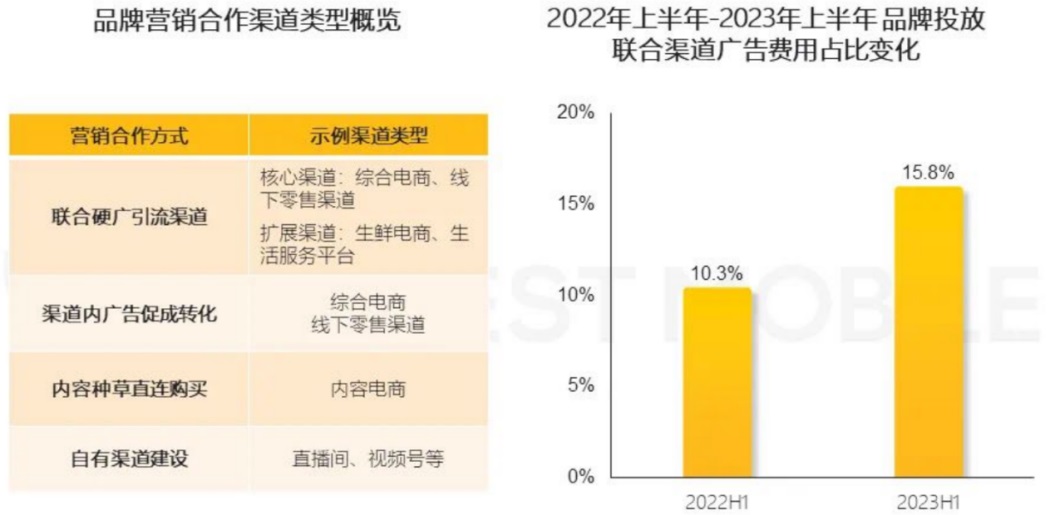 在做品牌投放时,广告主越来越倾向于联动渠道营销,从而推动品牌流量、声量和销量共同增长。QuestMobile《2023互联网广告市场半年报告》数据显示,2023年上半年,品牌投放联合渠道广告费用占比持续攀升,广告主整合多元渠道合作,全面布局转化。